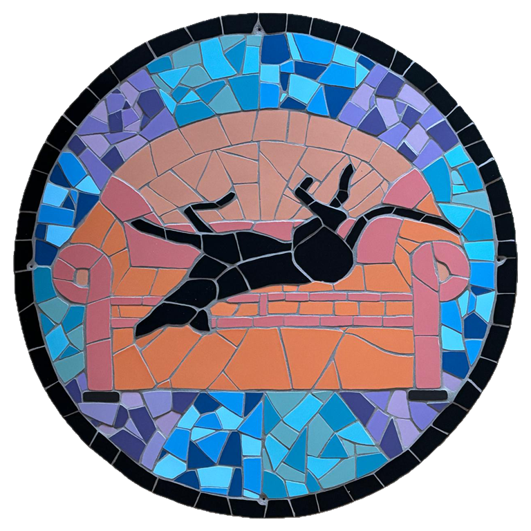 This fun and colourful circular exterior mosaic was made for the outside of a client’s home in Gosport, Hampshire, where she runs a home boarding service exclusively for Sighthounds.